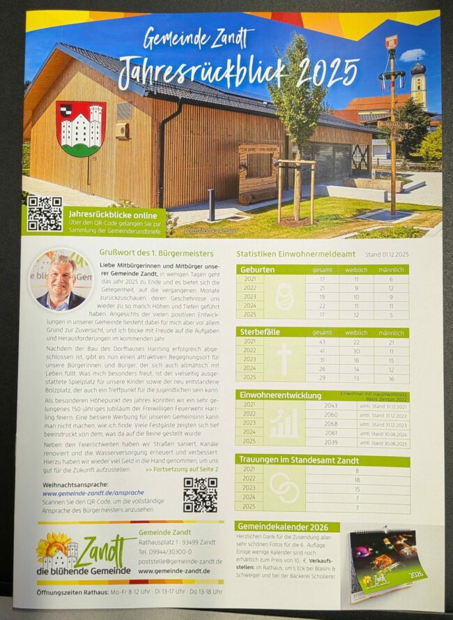 Der Gemeinderat Zandt hat in der Gemeinderatssitzung vom 19.12.2025 den Neuerlass der Entwässerungssatzung und Wasserabgabesatzung mit den jeweiligen Beitrags- und Gebührensatzungen der Gemeinde Zandt beschlossen. Die Satzungen können in der Gemeindeverwaltung, Rathausplatz 1, 93499 Zandt, Zimmer 3, während der allgemeinen Öffnungszeiten (Mo-Fr 08.00-12.00 Uhr, Di 13.00-17.00 Uhr, Do 13.00-18.00 Uhr) eingesehen werden. Abweichend hiervon können…