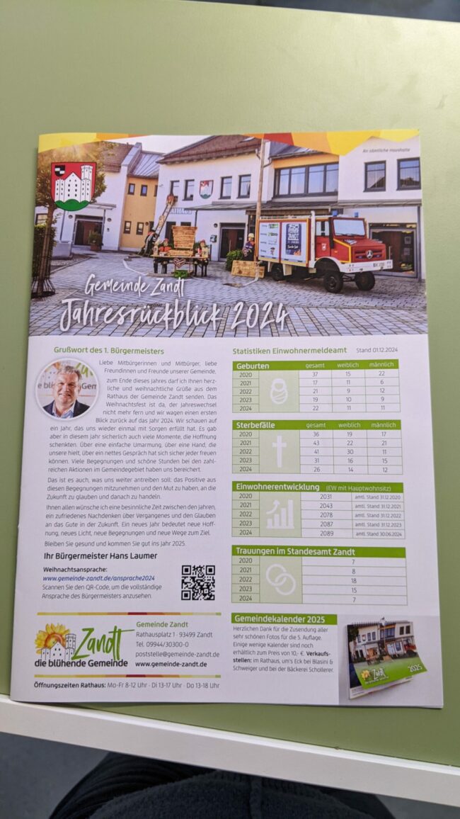 Die Gemeinde Zandt informiert im Gemeinderundbrief über das vergangene Jahr. Wichtige Zahlen und Fakten wie die aktuelle Einwohnerentwicklung, geplante und durchgeführte Bauvorhaben. Ein Rückblick in Bildern mit den wichtigsten Ereignissen 2024