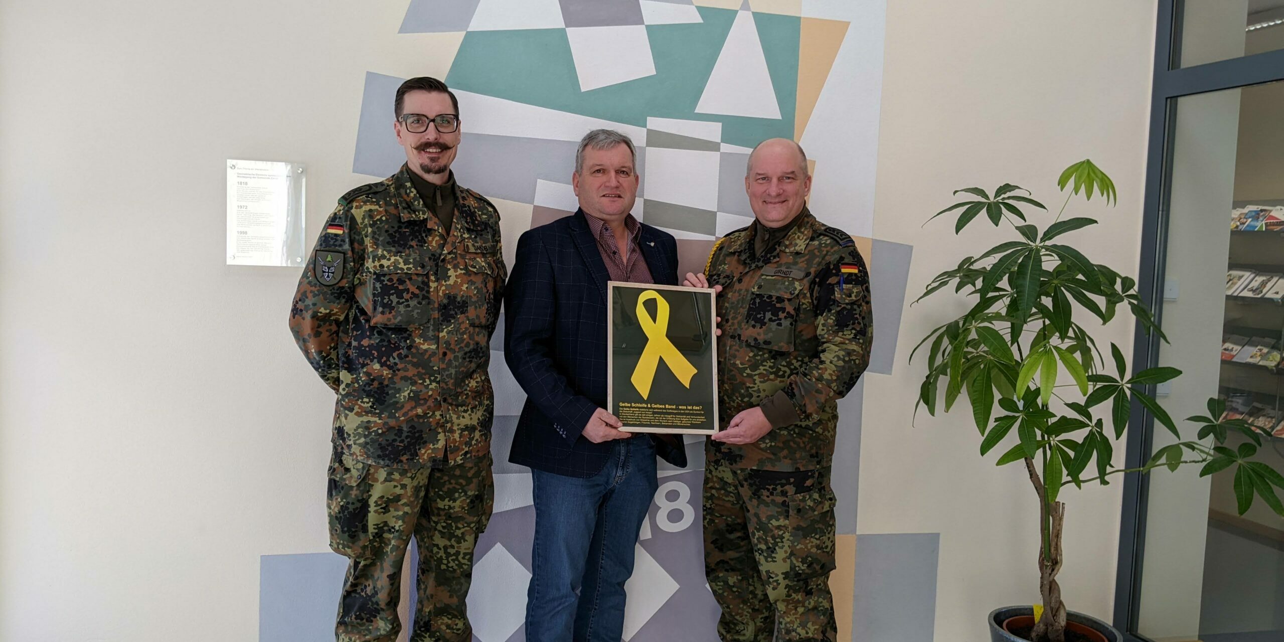 Den Eingangsbereich des Zandter Rathauses ziert seit Dienstag ein gerahmtes Bild mit der „Gelben Schleife“ der Aktion Brückenschlag, gedacht als ein Zeichen der Solidarität und der Verbundenheit der Bevölkerung mit den Angehörigen der Bundeswehr samt deren Wertschätzung.