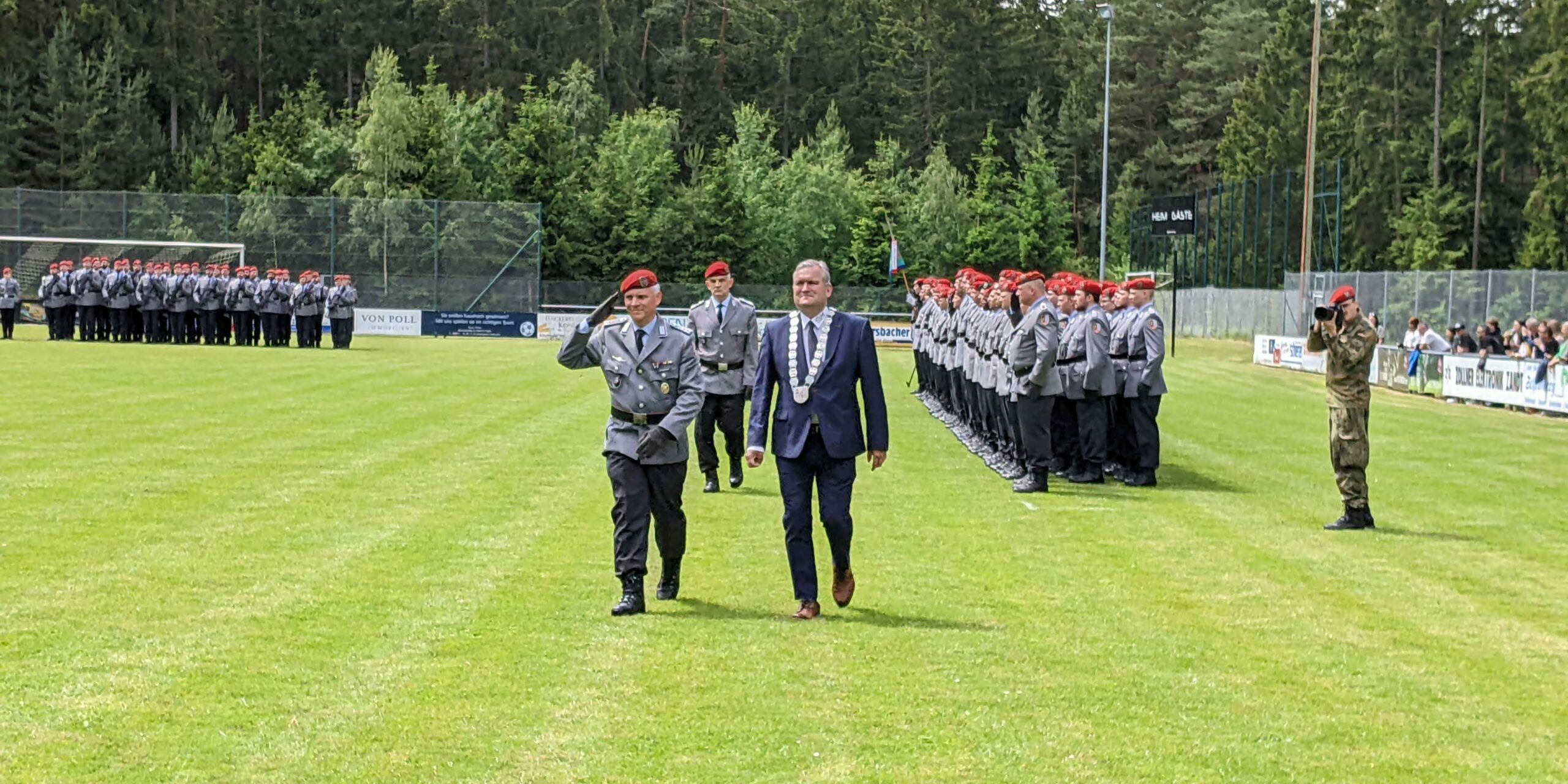 Die Rekruten marschierten, angeführt von Major Sina F., in das Stadion ein. Oberstleutnant Dr. Tobias Gößlbauer dankte den vielen Helfern im Hintergrund, die dieses Gelöbnis möglich machten. „Doch ich möchte mich zuvorderst nun an Sie, meine Rekrutinnen und Rekruten, wenden. Sie werden geloben, der Bundesrepublik Deutschland treu zu dienen und das Recht und die Freiheit des deutschen Volkes tapfer zu verteidigen“, sagte er. Die Rekruten würden somit Teil der Bundeswehr, die am 12. November 1955 ins Leben gerufen wurde. Dieser Gründungstag sei damals nicht zufällig gewählt worden. „Der 12. November ist der Geburtstag des preußischen Militärreformers Gerhard von Scharnhorst, der den Militärdienst als Ehrendienst an der Nation definierte“, so der Redner.