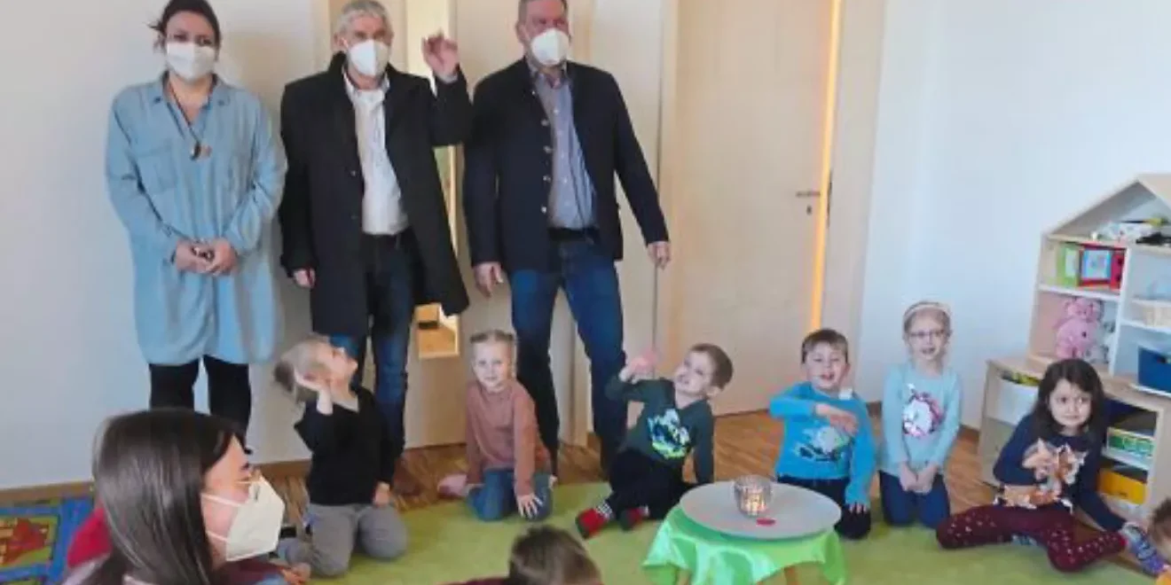 „Die Bauzeit betrug insgesamt ein Jahr“, so der Bürgermeister bei der Führung, „Kosten sind in etwa 3,2 Millionen Euro bei dem Bau entstanden. Schwierigkeiten hatten wir während der Bauzeit wegen fehlendem Baumaterial, dadurch hat sich die Bauzeit leider etwas verlängert.“ Untergebracht ist im neuen Haus auch die Kinderkrippe – eine Gruppe der Krippe ist aber im alten Gebäude ausgelagert. Vorgesehen sei, eventuell eine Waldkindergruppe einzurichten, bei der die Kinder einen Tag in der Woche in der Natur verbringen, informierten Bürgermeister Laumer und Leiterin Mühlbauer